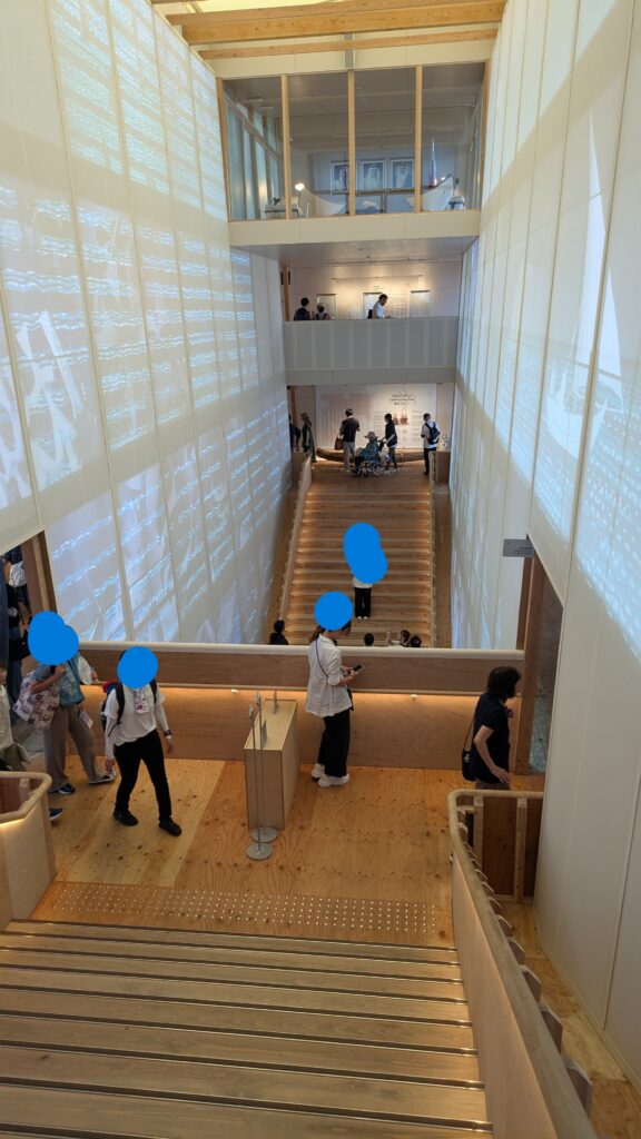 バーレーンパビリオンではヤシの木が有名でありそれを使用したヨットやその他楽器類などの展示が多くありました。あまりなじみのない国であり、初めて知ることも多く興味深い展示物が多くありました。ここのパビリオンでは展示物に直接触ることが出来たのが魅力的ポイントであり、吹き抜けの建物になっているため全体を見渡せる作りになっているのも建築が好きな人からするとポイントが高いのかなと思いました。