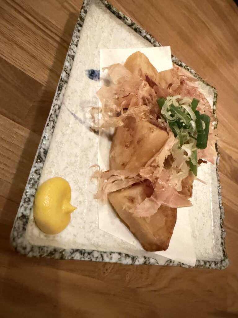 噛んだ瞬間にじゅわっと出てくる出汁の旨みが印象的で、揚げ物なのに重すぎず、つい箸が進みます。大根のやさしい甘みと衣の香ばしさのバランスがよく、日本酒や芋焼酎とも相性◎