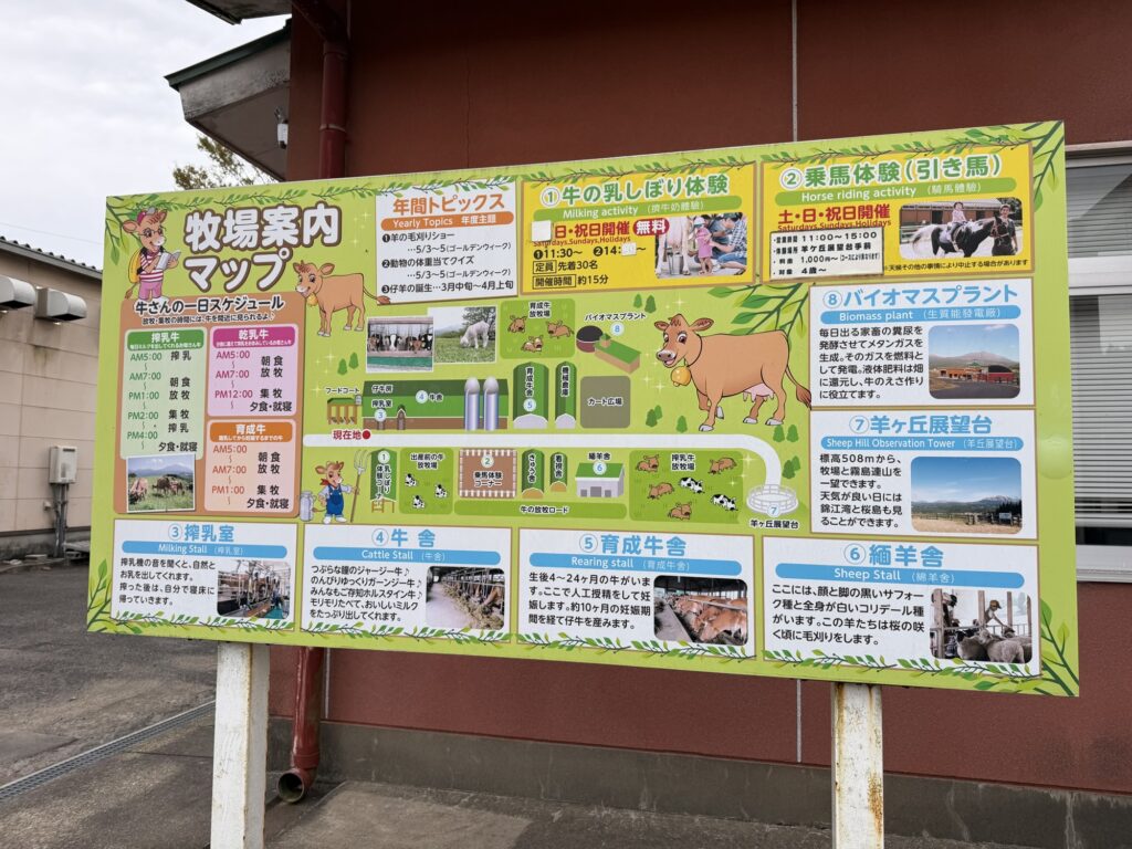 乳しぼりは11:00の1回のみ、乗馬は午後は混みやすいので、体験メインなら10:30頃までには牧場に着いておくと安心。