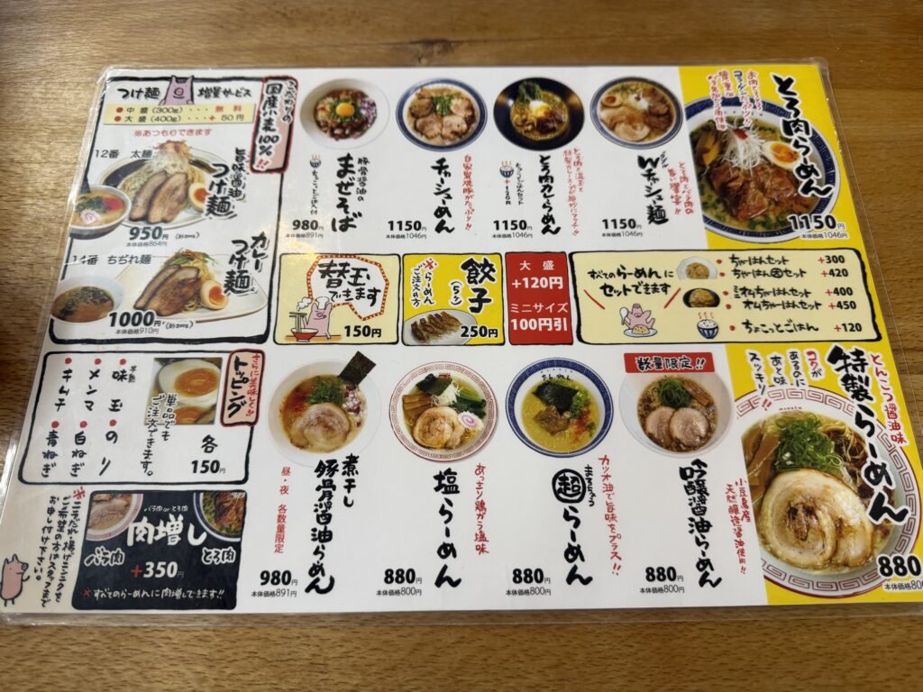 豚骨系が中心かと思いきや、醤油・塩・煮干し・まぜそば・つけ麺まで揃っていて、初めて来る人は確実に迷うやつ。